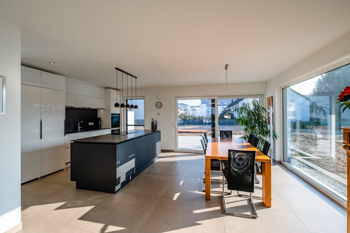 Offener Koch-, Ess- und Wohnbereich als kommunikativer Mittelpunkt mit großzügigen Fensteröffnungen