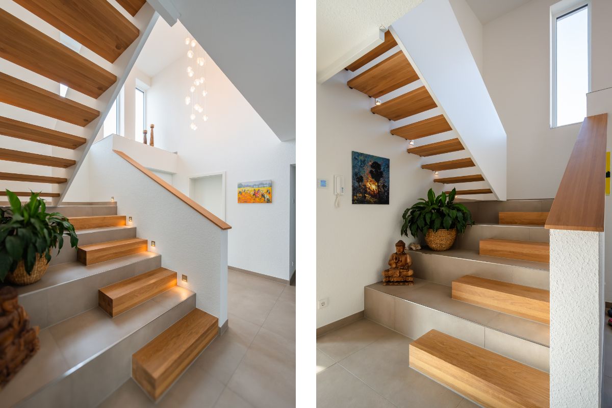 lichtdurchfluteter Eingang mit Luftraum und kunstvoller Treppe